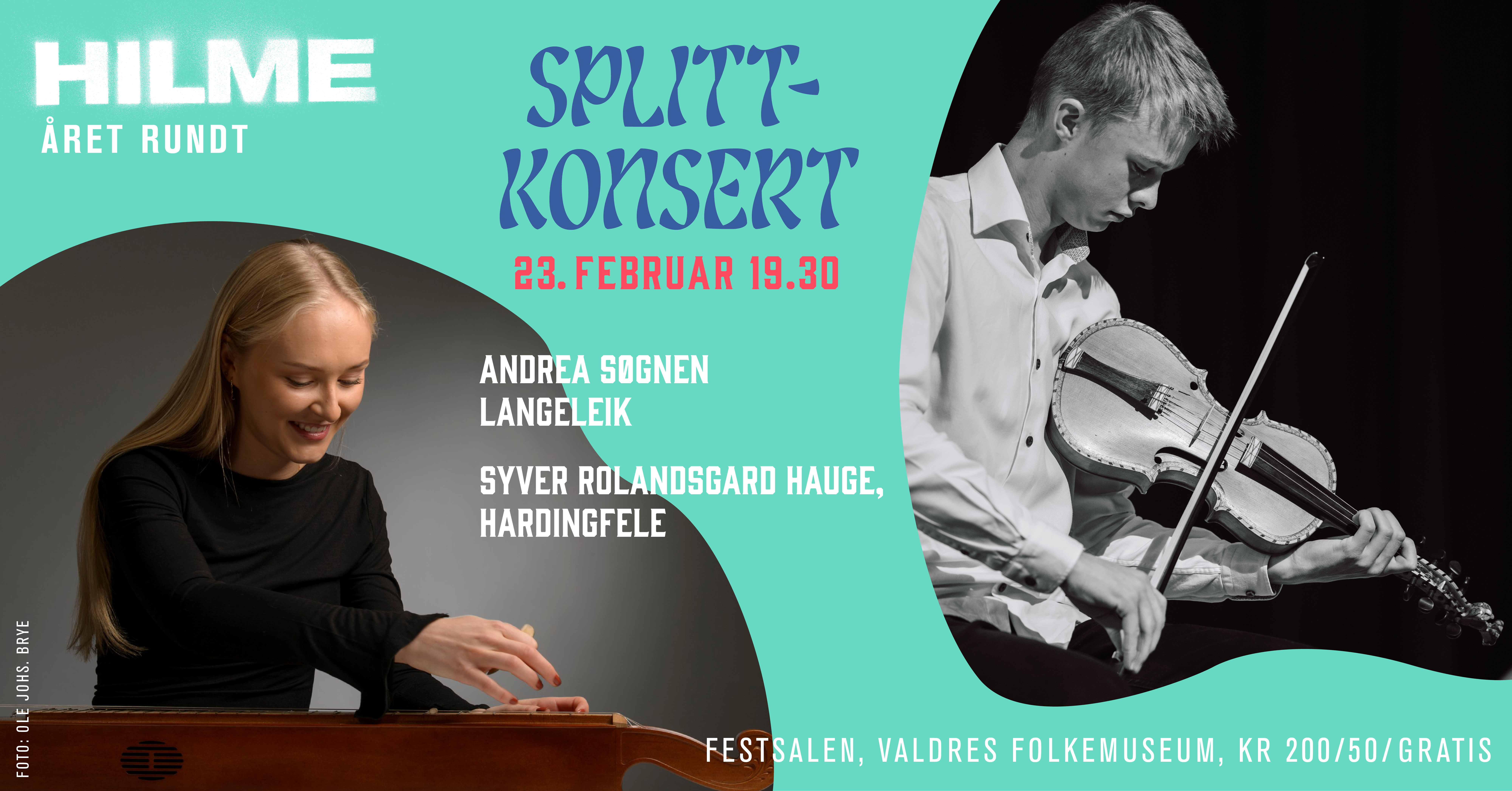 To av landets fremste unge folkemusikarar på sine instrument: Andrea Søgnen, langeleik og Syver Rolandsgard, hardingfele møtast i ein splittkonsert på fyrste «Hilme året rundt»-konserten denne sesongen. Med ei stor dose speleglede og energi møter dei to publikum til ei nær og intens musikalsk oppleving. Dei syner oss korleis dei inspirerast og lærar frå dei musikalske kjeldene og førebileta sine og på ulike vis utviklar sin eigen spelestil. Velkommen!
